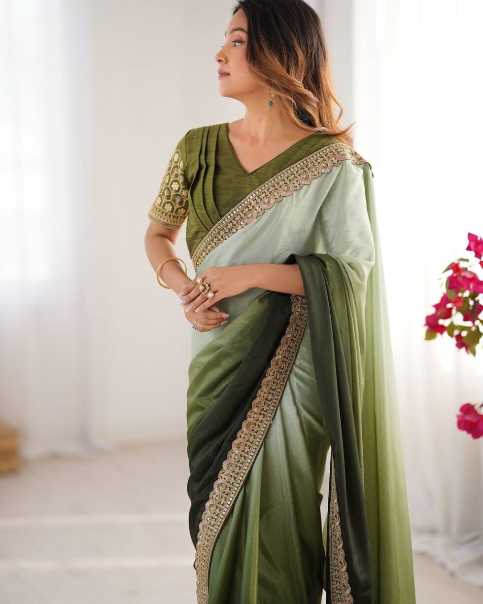 Women’s Elegant Ombre Green Georgette Saree with Intricate Golden Zari & Stone Embellishments – Complete with Heavily Worked Blouse for Festive & Wedding Wear